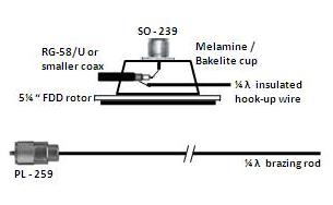The driven element is a ¼ λ length of 1.6mm brazing rod soldered to the PL-259 pin. The space between the PL-259 body and the driven element is filled with epoxy to prevent water ingress.